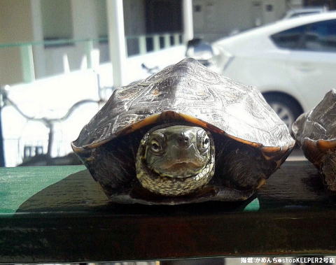 特徴:ゼニ亀(クサガメ)、尻尾の先っぽが切れて短くなってます