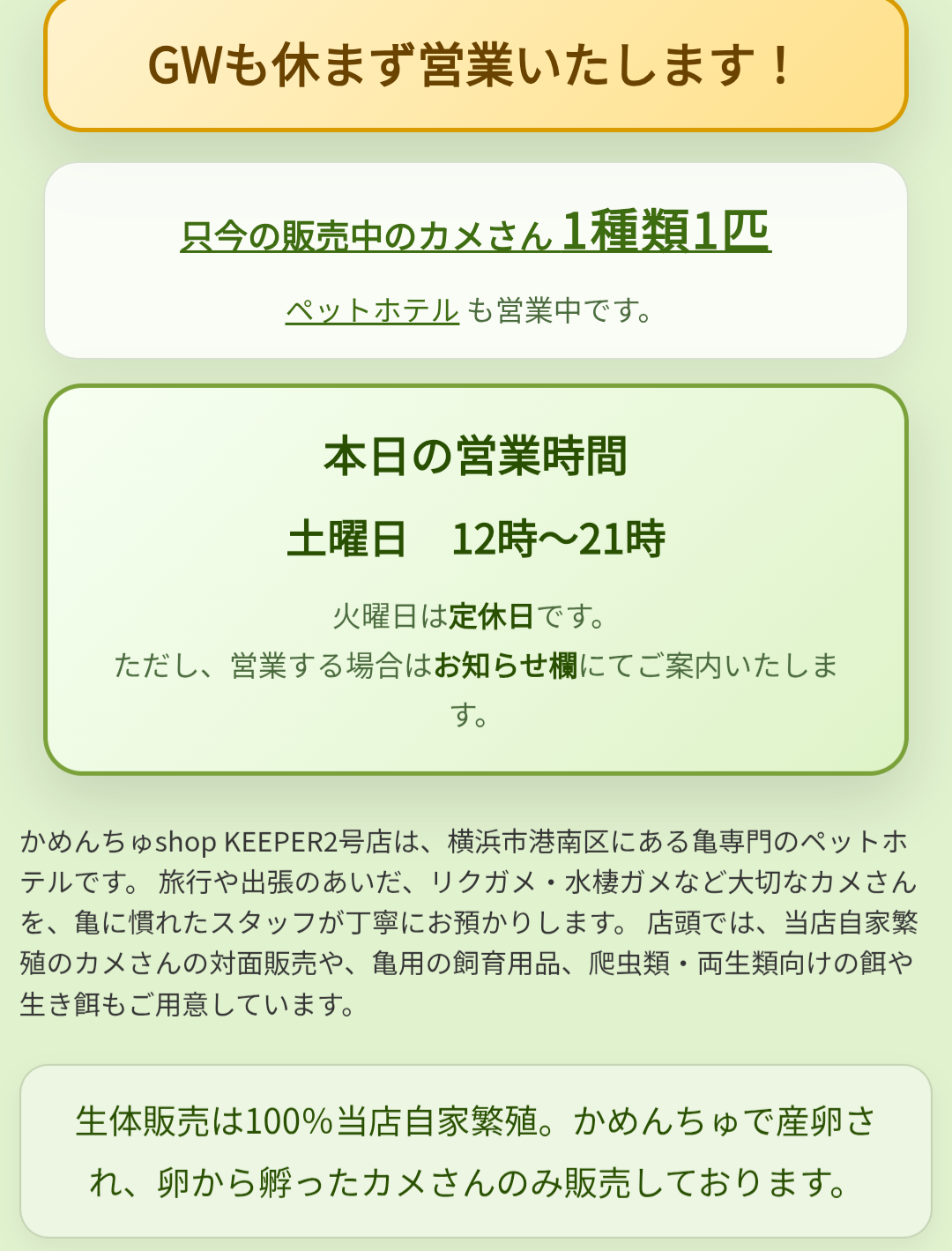 この度、トップページのシステムが変わり、わかりやすくなりました!いつでも正確な営業日、営業時間、お知らせがご確認いただけるようになりました!迷ったときには当公式サイトトップページで決まりっ!これからもよろしくお願いします。